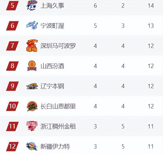 第5-12的排名變化幅度也很大,上海落后青島一個身位繼續(xù)穩(wěn)坐第5,本輪輸球的山西讓出第6下滑到第8,大黑馬寧波連升3名來到第6,深圳在擊敗遼寧后也連升2名來到第7。