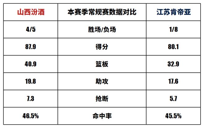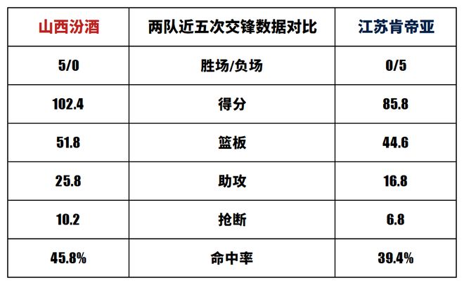 山西汾酒與江蘇肯帝亞歷史上一共交手39次,山西汾酒23勝16負。上賽季兩隊交手2次,山西汾酒2勝0負。