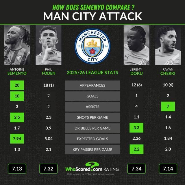 塞梅尼奧則已經(jīng)在櫻桃證明了他有扛旗的能力,他是目前英超射手榜的第三位,有10球入賬,還有3次助攻。他的速度很迅猛,沖擊力極強,絕活還有極為均衡的左右腳能力。無論是出任右邊鋒還是左邊鋒,塞梅尼奧都可以內(nèi)切射門又或者下底傳中。當(dāng)然傳球并不是塞梅尼奧的特長,至少相比曼城原有的幾位高手,他場均1.3次的關(guān)鍵傳球數(shù)據(jù)低了不少。但這可能也有環(huán)境的因素,畢竟在伯恩茅斯,球隊更需要加納人自己去主攻。